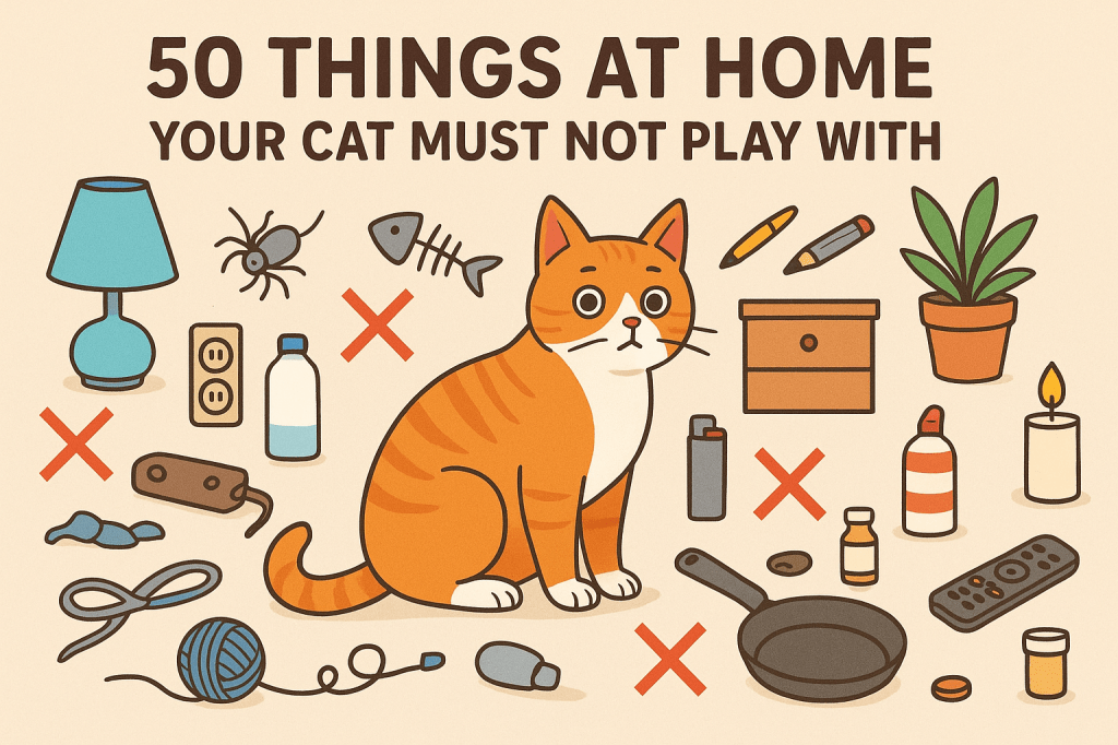 Below are 50 items/things to keep away from cats. I group them by category (plants, food, chemicals, household objects, etc.) to help you mentally map where to be especially watchful.